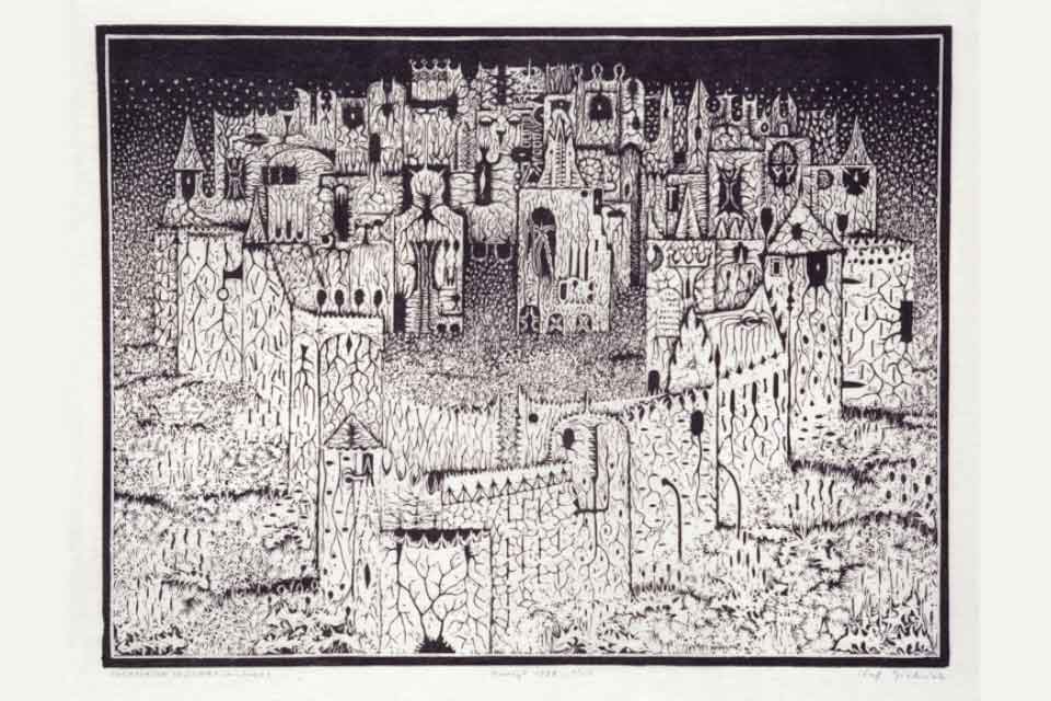 - Józef Gielniak „Improwizacja – elukubracja fantazyjna i krotochwilna”, 1963, linoryt, papier, z kolekcji Galerii Pegaz (własność: Urząd Miasta Zakopane), fot. Anna Hebda
