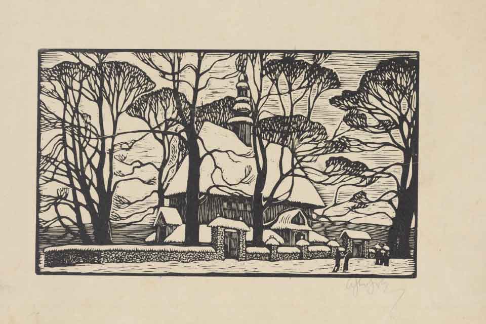- Władysław Skoczylas „Kościółek w zimie (Kościół na Obidowej) ” , 1933, drzeworyt, papier żeberkowy, ze zbiorów Gabinetu Rycin Biblioteki Uniwersyteckiej w Warszawie, fot. Bartłomiej Karelin