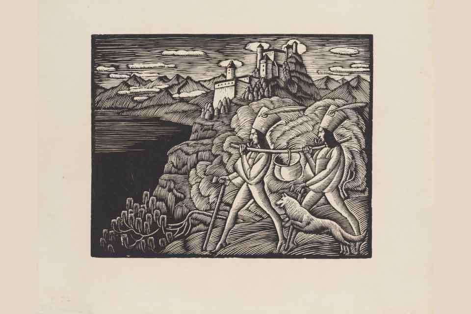 - Władysław Skoczylas „Zbójnicy ze skarbem „, 1918, drzeworyt, papier, ze zbiorów Gabinetu Rycin Biblioteki Uniwersyteckiej w Warszawie, fot. Bartłomiej Karelin